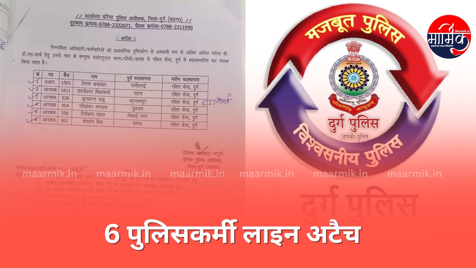 दुर्ग। जिले के वरिष्ठ पुलिस अधीक्षक विजय अग्रवाल ने प्रशासनिक फेरबदल करते हुए विभिन्न थाना व चौकी केंद्रों में पदस्थ 6 पुलिसकर्मियों को रक्षित केंद्र दुर्ग (लाइन) अटैच कर दिया है।