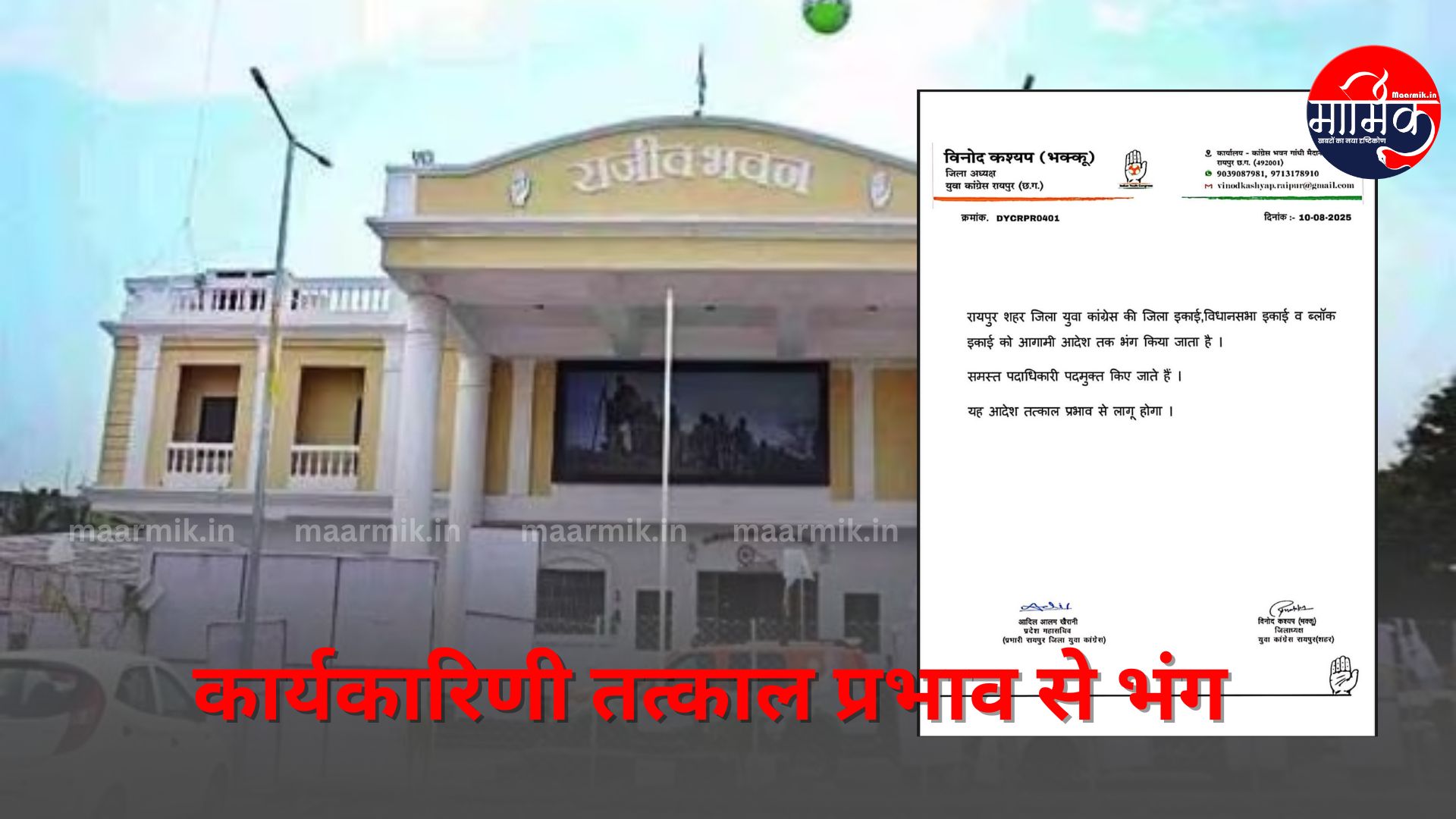 रायपुर: युवा कांग्रेस के भीतर लंबे समय से चली आ रही निष्क्रियता पर कड़ा कदम उठाते हुए रायपुर शहर जिला युवा कांग्रेस कमेटी और सभी विधानसभा अध्यक्षों को तत्काल प्रभाव से भंग कर दिया गया है। इस संबंध में आदेश युवा कांग्रेस के प्रभारी महासचिव आदिल आलम खैरानी और शहर जिला अध्यक्ष विनोद कश्यप ने जारी किए। मीडिया विभाग अध्यक्ष तुषार गुहा ने बताया कि कई पदाधिकारी और विधानसभा अध्यक्ष लंबे समय से संगठन के कार्यक्रमों से दूरी बनाए हुए थे, जिससे संगठन की सक्रियता और प्रभाव पर नकारात्मक असर पड़ा।