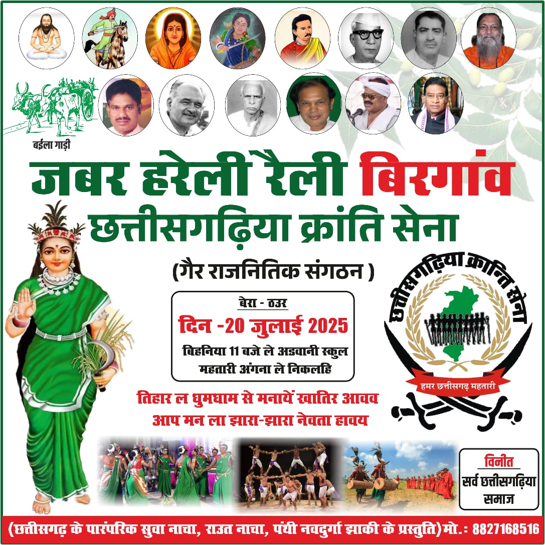 बिरगांव, रायपुर: छत्तीसगढ़ी संस्कृति, स्वाभिमान और पारंपरिक विरासत को जन-जन तक पहुंचाने के उद्देश्य से छत्तीसगढ़िया क्रांति सेना एक ऐतिहासिक आयोजन करने जा रही है। “जबर हरेली रैली” नामक यह भव्य रैली 20 जुलाई 2025, रविवार को बिरगांव स्थित आडवाणी स्कूल से प्रारंभ होकर महतारी आंगन तक निकाली जाएगी। आयोजन सुबह 11 बजे शुरू होगा।