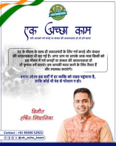यह पहल ठंड के दिनों में जरूरतमंदों के जीवन में एक सकारात्मक बदलाव लाने का प्रयास है।हर्षित सिंघानिया का मानना है कि समाज के हर वर्ग का सहयोग इस नेक कार्य को और भी सफल बना सकता है।